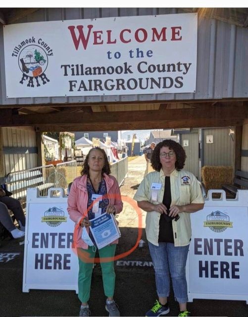 Tillamook County Commissioners Erin Skaar and Mary Faith Bell holding Indoor Mask Mandate Sign in front of Tillamook County Fair 2021Photo from video via Tillamook County Fair Facebook Page