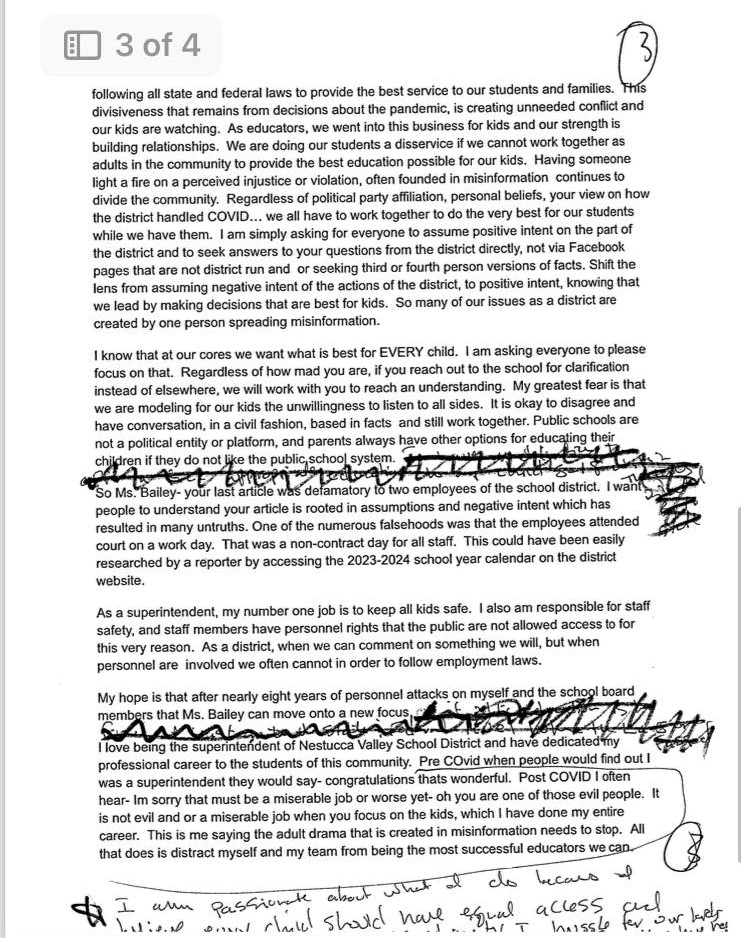 On October 16, 2023, the Superintendent of Nestucca Valley School District, Misty Wharton, made an unprecedented statement targeting an individual and reporter, saying, “So many of our issues as district are created by one person spreading misinformation.” This statement was about me, a wife, mother of four, homeschool mom. and reporter. To counter that this is a wild exaggeration against a citizen that has had no institutional power to make decisions in school policy or practice is an understatement. Any rational person understands that this could not possibly be true.