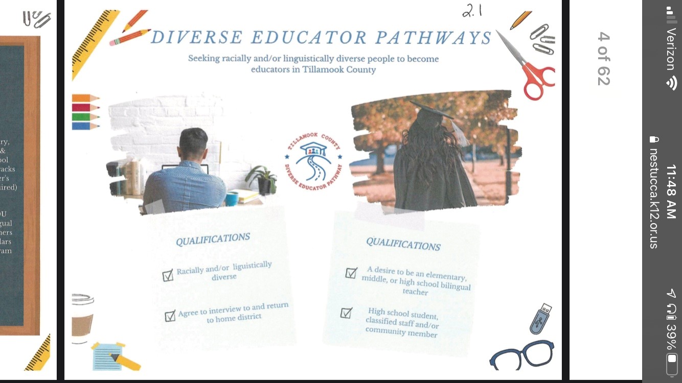 2. The advent of “identity” focused programs. In reality, there were probably multiple “identity” focused programs introduced during this time period. Public school officials rarely see the need to announce to non-school employed adults they are starting a Gay-Straight Alliance or Hispanics ONLY club. Most adults recognize these clubs as subversive to traditional morals (and parents), anti-American and unnecessarily divisive. However, Nestucca Valley School District was so proud of the Diverse Pathways Educators Program that is was introduced by the school counselor, Sharman Ensminger during a Zoom only attendance board meeting in late spring 2021. This program, a mentor program to recruit “diverse” teachers from the current student body, was presented as limited to those who are “racially and/or linguistically diverse.” Here is the current link on the Northwest ESD for that program: https://www.nwresd.org/departments/instructional-services/professional-learning/diverse-educator-pathways Here is one of the slides presented at the meeting by Ensminger concerning this program.